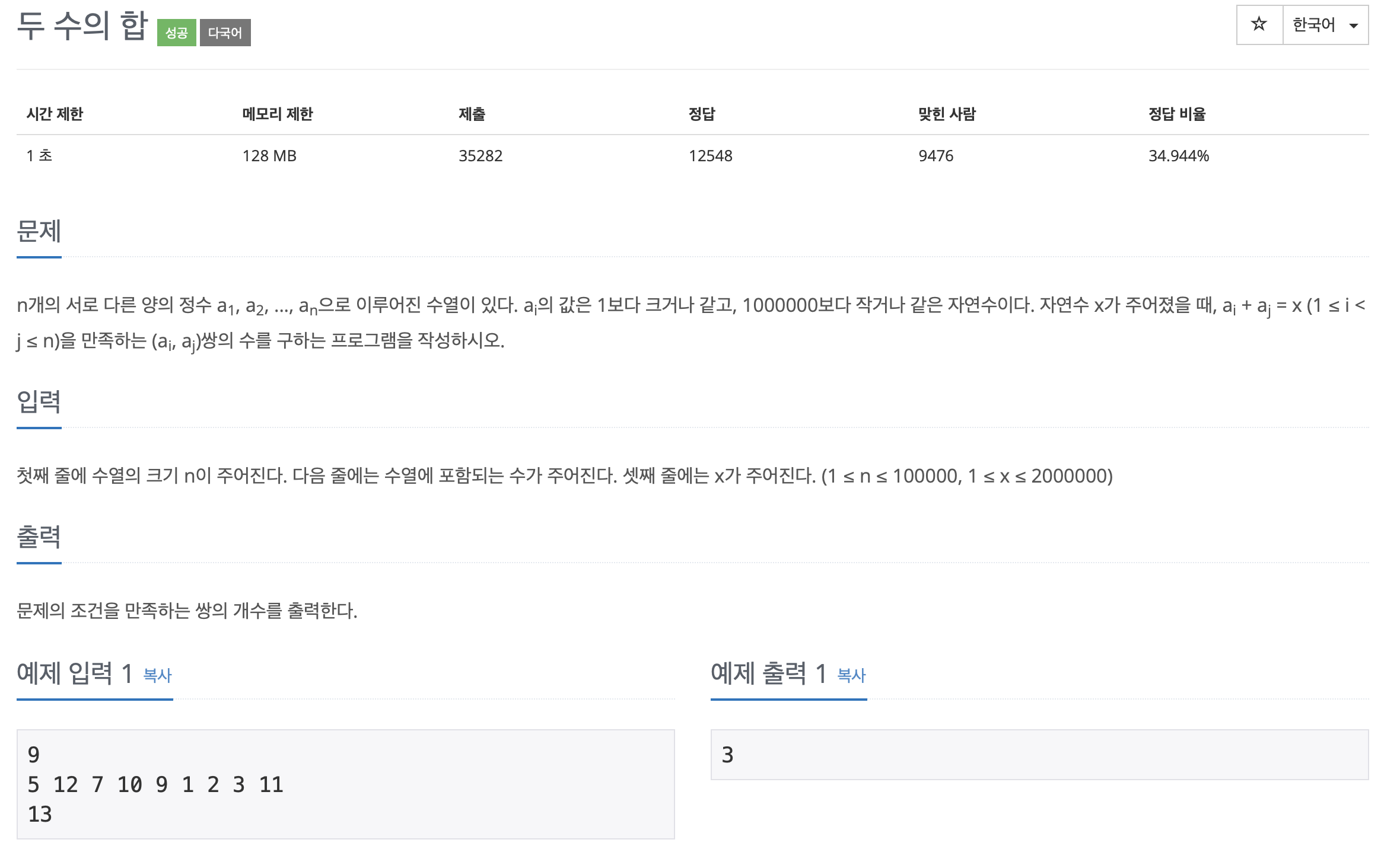 n개의 서로 다른 양의 정수 a1, a2, ..., an으로 이루어진 수열이 있다. ai의 값은 1보다 크거나 같고, 1000000보다 작거나 같은 자연수이다. 자연수 x가 주어졌을 때, ai + aj = x (1 ≤ i < j ≤ n)을 만족하는
