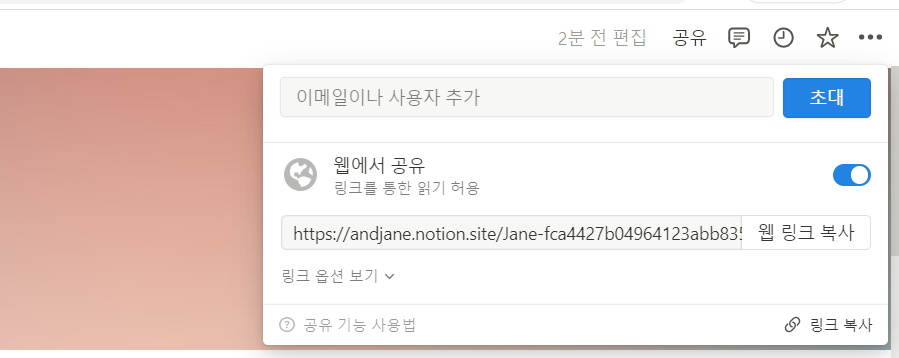 tip) 상단에 위치한 '공유'를 눌러 웹에서 공유를 허용해야 다른 사람이 볼 수 있다!