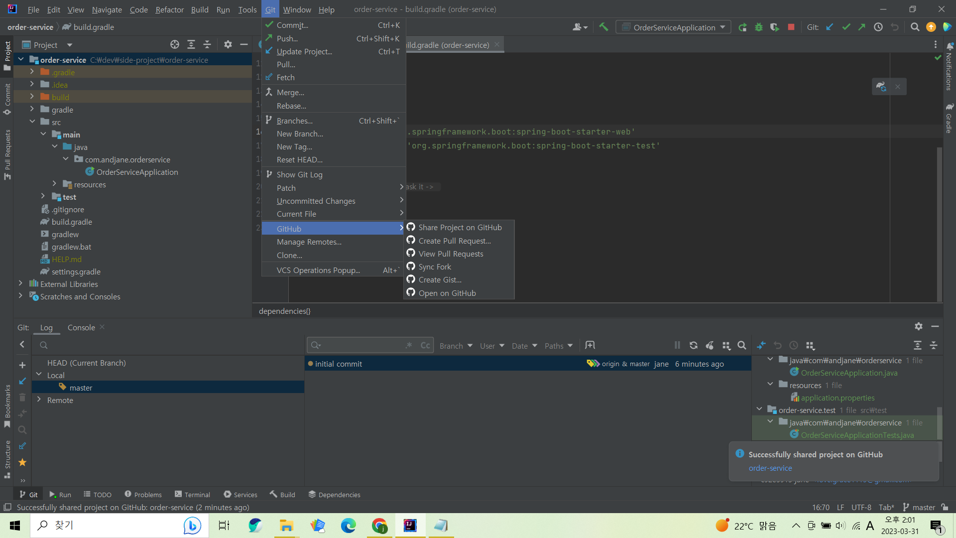 intelij에서 프로젝트 기준 git repository 생성하는 방법